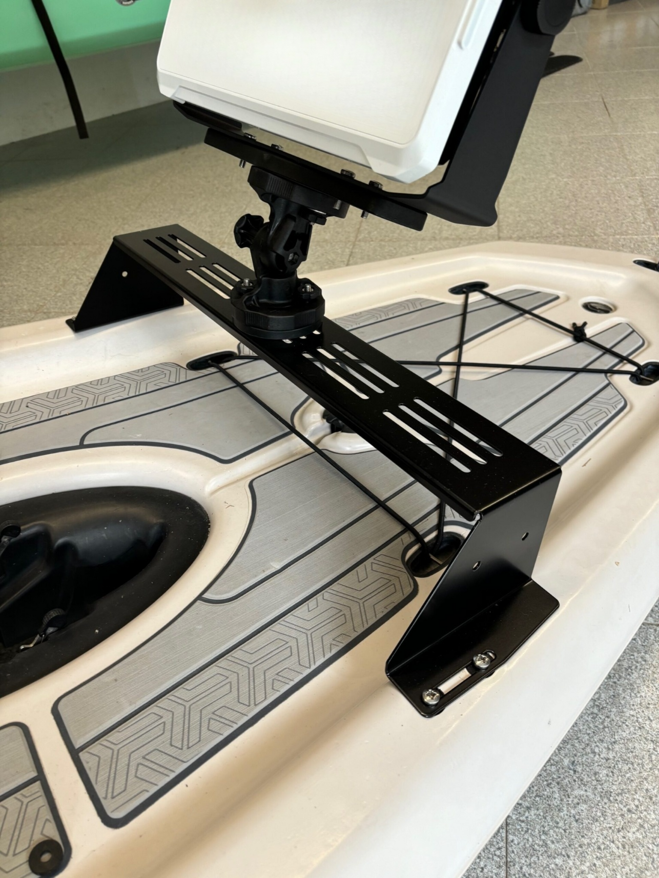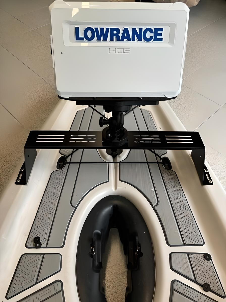 Mit dieser stabilen Halterung lässt sich ein größerer Echolot-Bildschirm direkt vor dem Antrieb montieren – perfekt im Sichtfeld und jederzeit griffbereit. Die Konstruktion sorgt für eine sichere und vibrationsfreie Befestigung, ohne den Rumpf zu beschädigen.