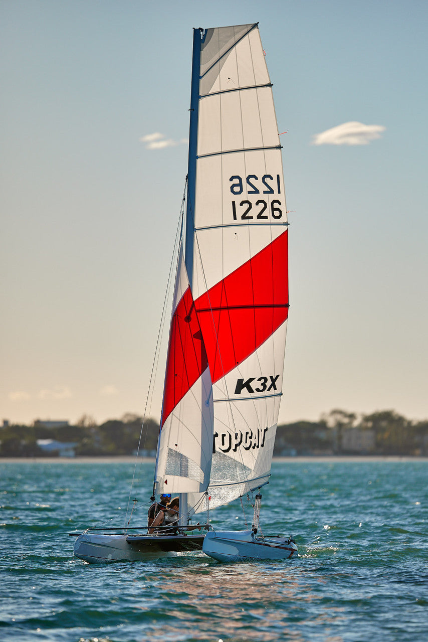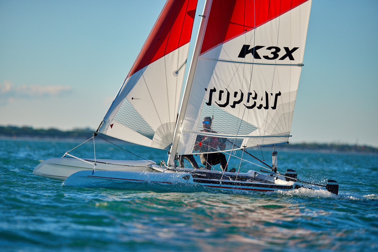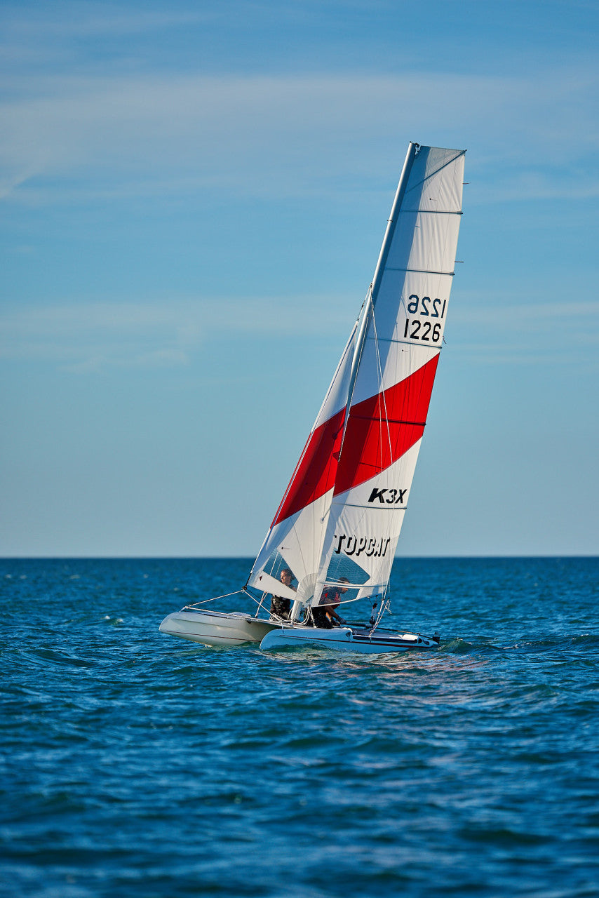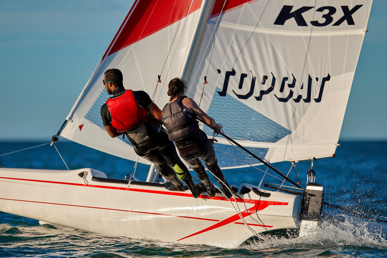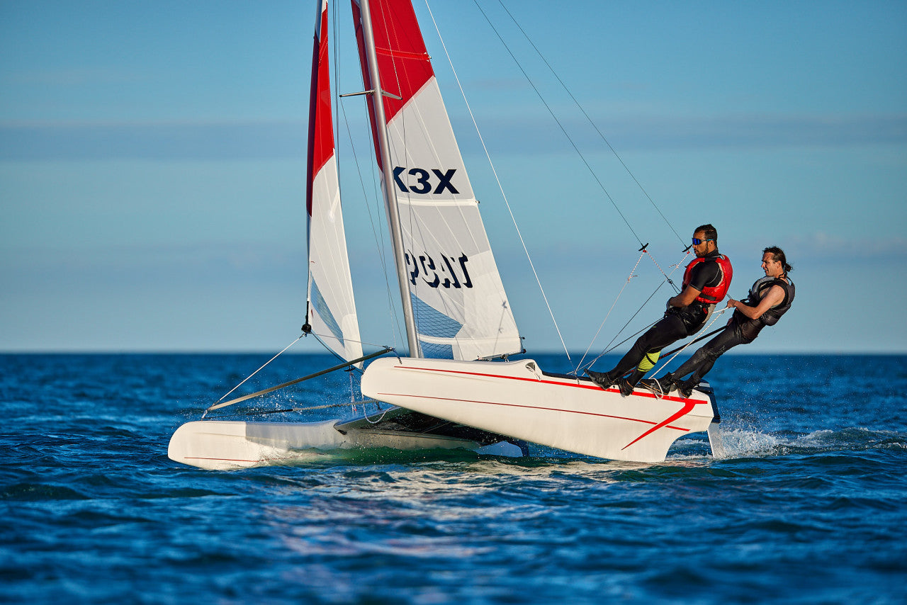 Mit dem TOPCAT K3X ACTIVE wird das sportliche Katamaran-Segeln zum absoluten Spaß! Dieses moderne 16er-Modell hat alles, was das Segler-Herz begehrt: Es ist perfekt ausbalanciert, bietet jederzeit Kontrolle und den Reiz eines sportlichen Katamarans. In der ACTIVE Konfiguration besinnt sich der K3X auf die Ursprünge des Katamaran Segeln und ist ausgestattet mit Großsegel und Fock. Es gibt zwei fantastische Segel-Optionen für den K3X: Die Classic Segel überpowern das Boot nicht, aber haben genug Potential für einen sportlichen Ritt über die Wellen. Die sportlicheren Streamcut Segel fordern die Segler mehr heraus und haben eine Menge Geschwindigkeitspotential. Egal, ob du allein, zu zweit oder zu dritt unterwegs bist – der K3X begeistert mit seiner einzigartigen Rumpfkonstruktion, die für herausragende Agilität und Drehfreudigkeit sorgt. Und das Beste daran: Alle ACTIVE Modelle sind bereits mit einem Sport-Paket ausgestattet!